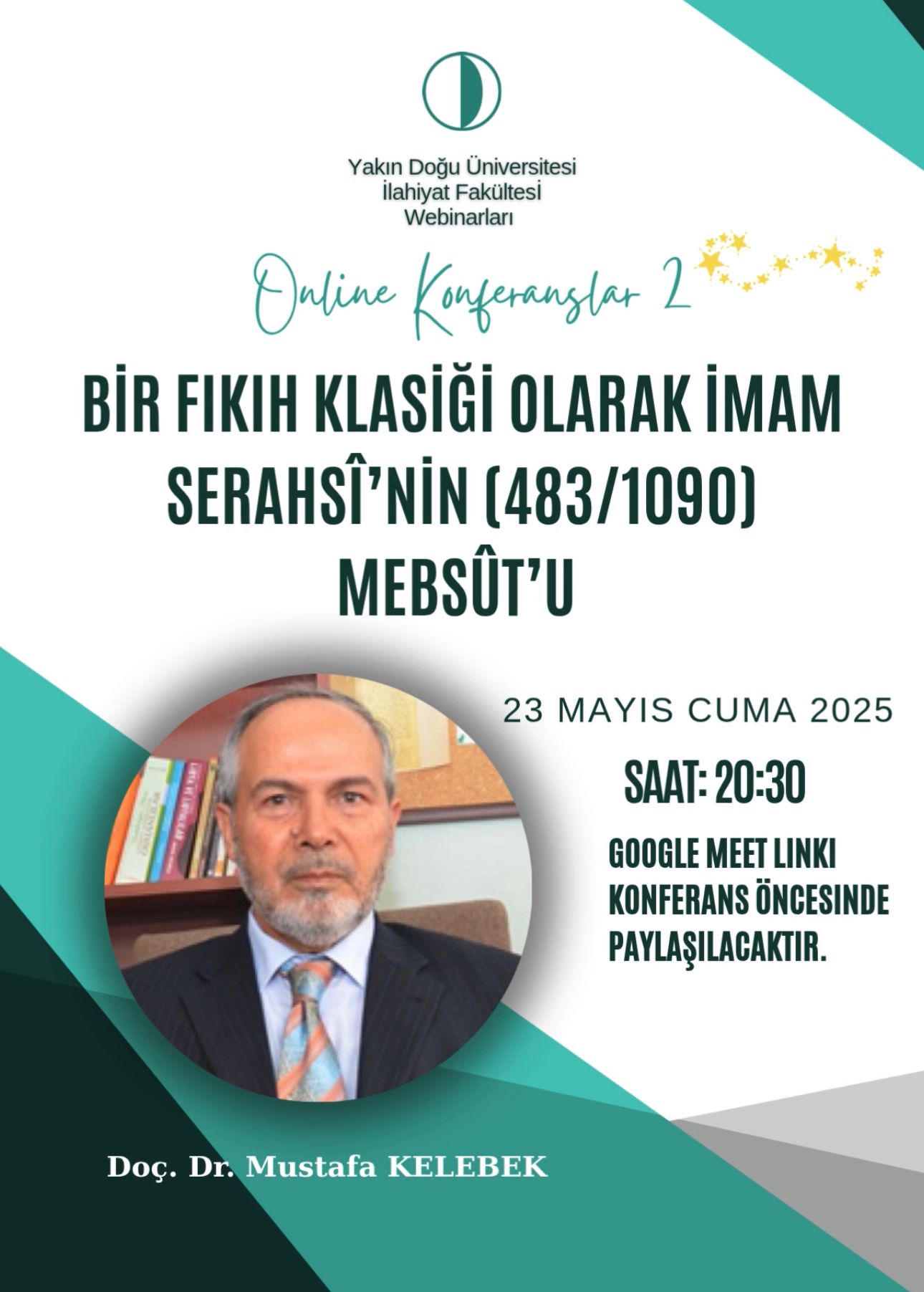 Yakın Doğu Üniversitesi İlahiyat Fakültesi olarak düzenlediğimiz online konferanslar dizisinin ikincisi, 23 Mayıs 2025 Cuma günü saat 20:30’da Google Meet platformu üzerinden gerçekleştirildi. “Bir Fıkıh Klasiği Olarak İmam Serahsî’nin (483/1090) Mebsût’u” başlıklı konferans, Doç. Dr. Mustafa Kelebek’in sunumuyla dinleyicilerle buluştu. Doç. Dr. Kelebek, İmam Serahsî’nin İslâm hukuk literatüründe önemli bir yere sahip olan el-Mebsût adlı eserini tarihsel bağlamı, metot özellikleri ve fıkıh ilminin gelişimindeki katkıları bakımından değerlendirdi. Konuşmasında, Serahsî’nin hem dönemindeki ilmî çevreyle olan etkileşimini hem de sonraki fıkıh çalışmalarına olan etkisini vurgulayan hocamız, Mebsût’un klasik fıkıh eserleri arasında neden ayrıcalıklı bir yere sahip olduğunu örneklerle açıkladı.Katılımcıların yoğun ilgi gösterdiği konferans, soru-cevap bölümüyle sona erdi. Online Konferanslarımız her cuma saat 20:30’da herkese açık bir şekilde devam edecektir. Bağlantı linkleri ilgili sosyal medya hesaplarımız üzerinden paylaşılmaktadır.