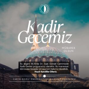 Yakın Doğu Üniversitesi İlahiyat Fakültesi olarak, mübarek Kadir Gecesi’ni Dr. Suat Günsel Camii’nde düzenlediğimiz Kur’ân-ı Kerîm ve Mevlid-i Şerîf programıyla idrak ettik. Gecenin manevi atmosferine uygun olarak gerçekleştirilen program, BRT TV ekranlarından da canlı olarak yayınlanarak geniş kitlelere ulaştı. Kur’ân-ı Kerîm tilaveti, salavatlar ve dualarla ihya edilen bu mübarek geceye, üniversite mensuplarımız ve cemaat yoğun ilgi gösterdi. Programda, Kadir Gecesi’nin faziletleri ve Ramazan ayının manevi kazanımları üzerine de hatırlatmalar yapıldı. Yakın Doğu Üniversitesi İlahiyat Fakültesi olarak, bu tür manevi programların toplumsal birlikteliğe katkıda bulunmasını temmeni eder, Kadir Gecesi’nin tüm İslam âlemine hayırlar getirmesini dileriz.