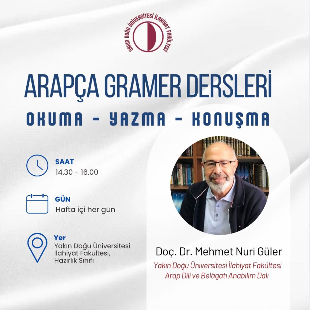 Yakın Doğu Üniversitesi İlahiyat Fakültemizin hocalarından, Doç. Dr. Mehmet Nuri Güler’in rehberliğinde düzenlenen ücretsiz “Arapça Gramer Dersleri (Okuma-Yazma-Konuşma)” kursuyla öğrencilerine dil becerilerini geliştirme fırsatı sunuyor. Bu takviye kursu, Arapça okuma, yazma ve konuşma yetkinliklerini artırmayı hedefliyor. Dersler, hafta içi her gün 14:30-16:00 saatleri arasında, İlahiyat Fakültesi 1. kattaki hazırlık sınıfında yüz yüze olarak gerçekleştiriliyor. Tüm öğrencilerin katılımına açık olan bu kurs, hem Arapça öğrenmeye yeni başlayanlara hem de dil bilgilerini geliştirmek isteyenlere yönelik olarak hazırlanmıştır. Katılım için herhangi bir ön kayıt şartı aranmamaktadır. Bu eşsiz fırsattan faydalanmak isteyen tüm öğrencilerimizi derslere bekliyoruz.