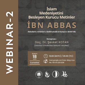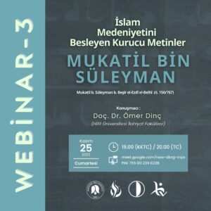 İslam Medeniyetinin Kurucu Metinlerini Tanıtma Projesi kapsamında her hafta cumartesi günü düzenlediğimiz webinarlarımızın açılışında İslamî ilimlerin tamamını besleyen Kur’an-ı Kerim’in kaynaklığını, ikinci haftamızda ise İbn Abbas’ı değerlendirdiğimiz programımızda bu hafta ise; Doç. Dr. Ömer DİNÇ’in katkılarıyla Mukâtil b. Süleyman’ın İslam medeniyetine katkılarını dinledik. Hocamıza değerli sunumundan ötürü teşekkür ederiz.