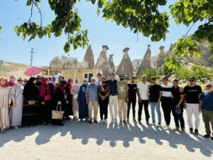 Takviye Arapça kursu kapsamında Ankara’da bulunan öğrencilerimiz, sabahın erken saatlerinde Kapadokya seyir tepesinde balonların mistik kalkışını izleyerek geziye başladılar. Öğrencilerimiz, rehberler eşliğinde sırasıyla Avanos’un el sanatlarıyla ünlü çömlekçilerini, Kızılırmak’ın meşhur köprüsünü ve turistik mekanlarını gezdiler. Ardından Meşhur Kapadokya Hanı’nın tarihi atmosferini yaşayarak geçmişe yolculuk yaptılar. Doğal güzellikleriyle ünlü Paşabağ Peri Bacaları’nda gezip, buranın eşsiz güzelliklerini gözlemleyen öğrencilerimiz daha sonra Tarihi Çömlekçi atölyelerini ziyaret ederek, el yapımı çömleklerin inceliklerini öğrendiler.