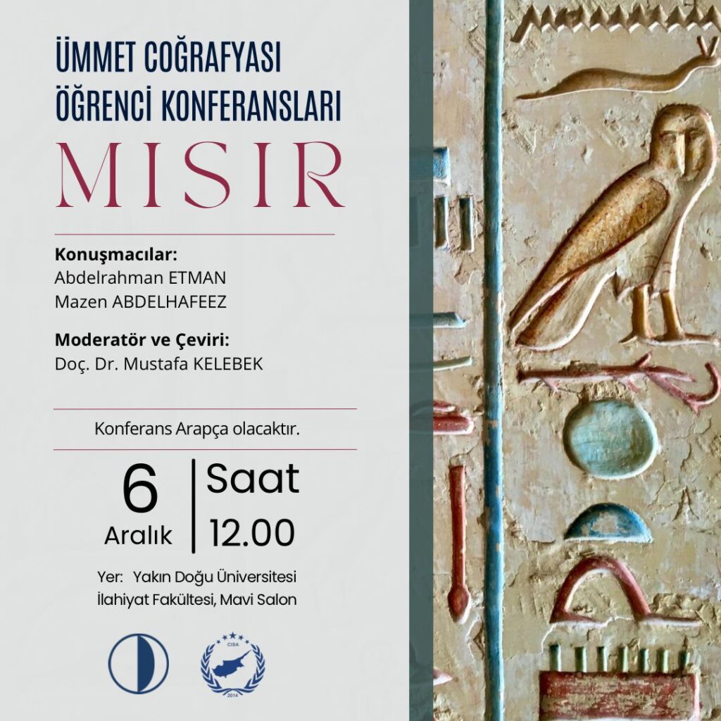 “Ümmet Coğrafyası Öğrenci Konferansları” Kapsamında Düzenlediğimiz Programımızın Bu Haftaki Konuğu Kıbrıs Uluslararası Öğrenci Derneği’dir. Mısır’daki Sosyal ve Kültürel Yaşam Hakkında Gerçekleştirilecek Olan Konferans Bütün Katılımcılara Açıktır. Tarih, yer ve saat bilgileri aşağıdaki gibidir;