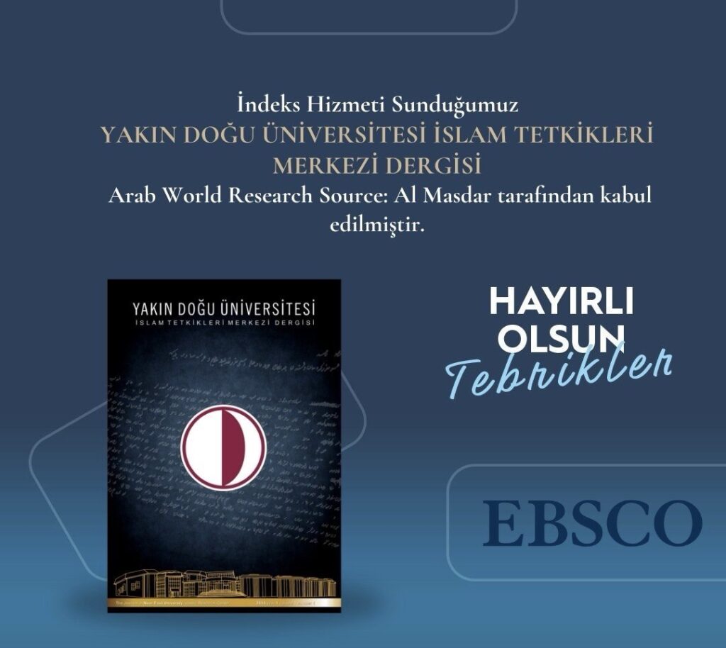 Yakın Doğu Üniversitesi İslam Tetkikleri Merkezi Dergimiz, uluslararası bilimsel camianın dikkatini çeken bir gelişmeye imza attı. Dergimiz, dünya çapında açık erişim dergilerini tarayan prestijli bir indeks olan EBSCO tarafından kabul edilmiş ve bu indekste taranmaya başlamıştır. Bu kabul, dergimizin uluslararası akademik topluluk tarafından tanındığını ve kaliteli bilimsel yayınlar sunduğunu göstermektedir.